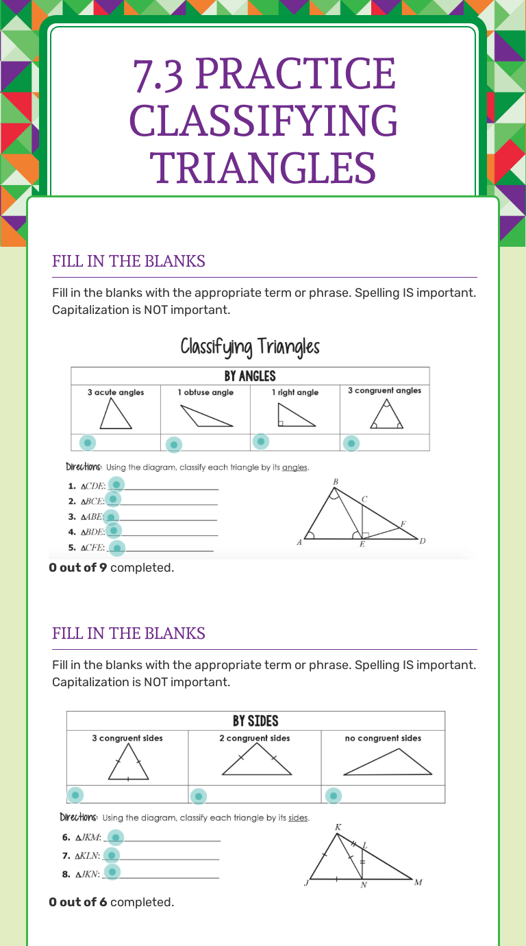 28+ Classifying Triangles Worksheet. In this classifying triangles worksheet, students classify . This free worksheet contains 10 assignments each with 24 questions with answers. Classify this triangle by its angles. Classify triangles classify triangles as: Triangles online worksheet for 4.